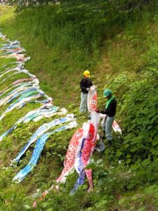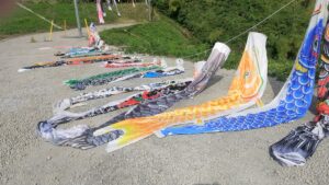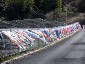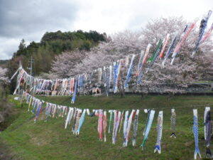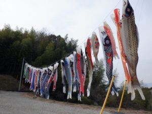 送られてきたこいのぼりは必ず1度は泳がせ、小さいサイズのものは1列にして金網に結んでいる。山中にたなびく姿は壮観で、桜が咲くこの時期は色とりどりの見事な鯉を鑑賞できる。